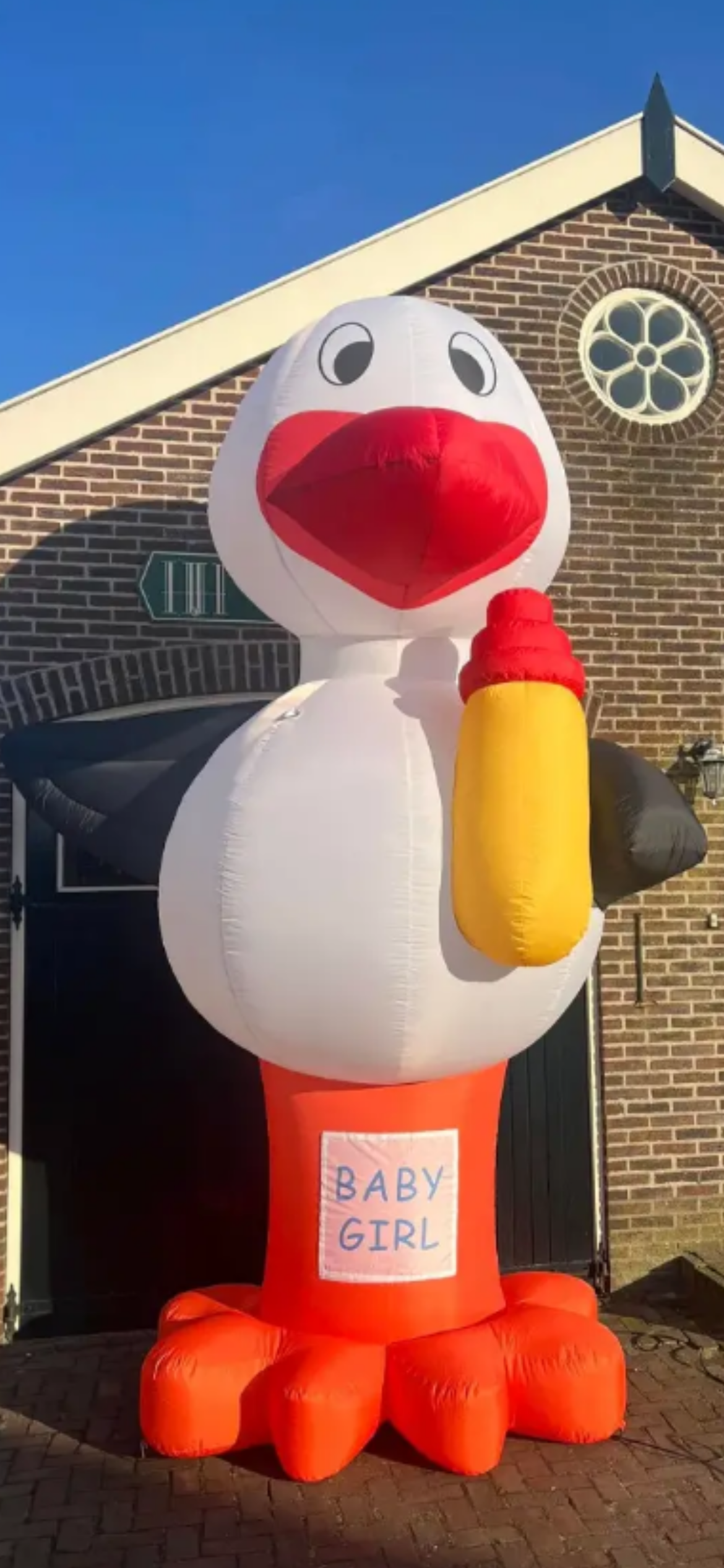 Hebben jullie iets te vieren? Laat de hele buurt weten dat er een kleintje is geboren met deze vrolijke opblaasbare ooievaar van maar liefst 4 meter hoog!